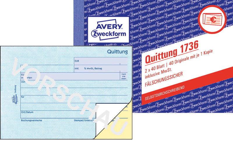 Bestätigen Sie den Verkauf von Waren oder Dienstleistungen mit den Quittungen von Avery Zweckform. Die Quittung, inklusive MwSt., ist mit einem feinen, netzartigen Hintergrunddruck ausgestattet. Somit ist die Quittung garantiert Fälschungssicher. Profitieren Sie von der langjährigen Erfahrung vom Formularexperten Avery Zweckform.