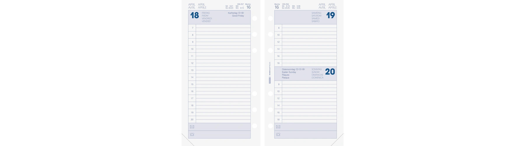 - Ausführung der Kalenderaufteilung: 1 Tag/1 Seite
