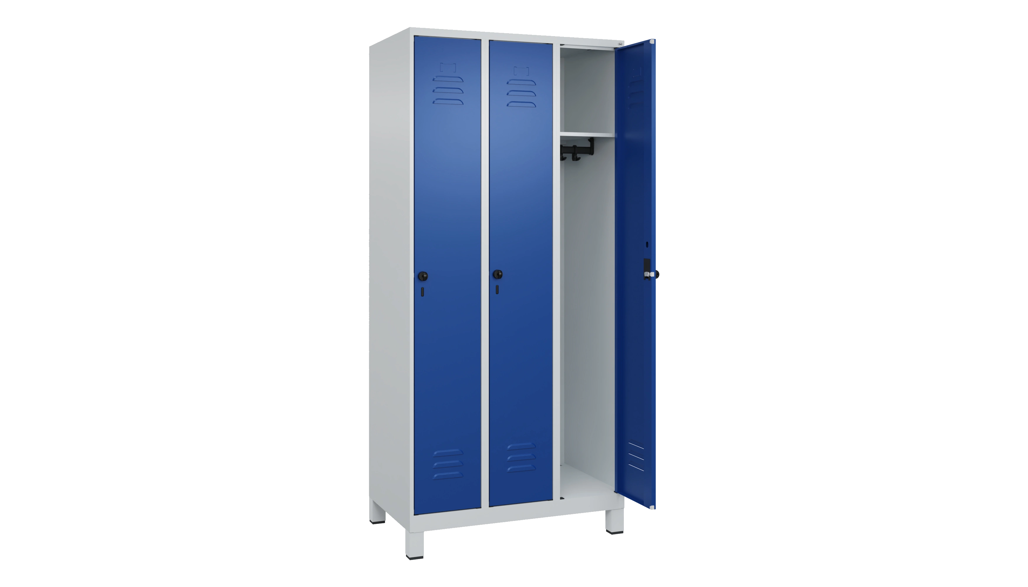 Garderobenschrank Classic PLUS, aus stabiler Konstruktion mit hochwertiger Einbrennbeschichtung für hohe UV- und Korrosionsbeständigkeit, mit hinteren Belüftungsöffnungen oben und unten, 1 stabile Garderobenstange aus Ovalprofil mit 3 verdrehsicheren Doppel-Schiebehaken inkl. Systemaufnahme. Türaufhängung rechts. Türen mit Soft-Anschlag und geschlossenen Seitenprofilen für hohe Stabilität, mit Lüftungskiemen oben und unten sowie eingestanztem Etikettenrahmen, Aufhängung in stabilen Drehbolzen. Schrank auf 100 mm hohen Kunststoff-Füßen, Fußteil zusätzlich verzinkt für noch besseren Korrosionsschutz. Verschließbar mit Sicherheits-Drehriegelverschluss für Vorhangschloss. Achtung: Anlieferungsmöglichkeit durch Sattelschlepper muss gegeben sein.