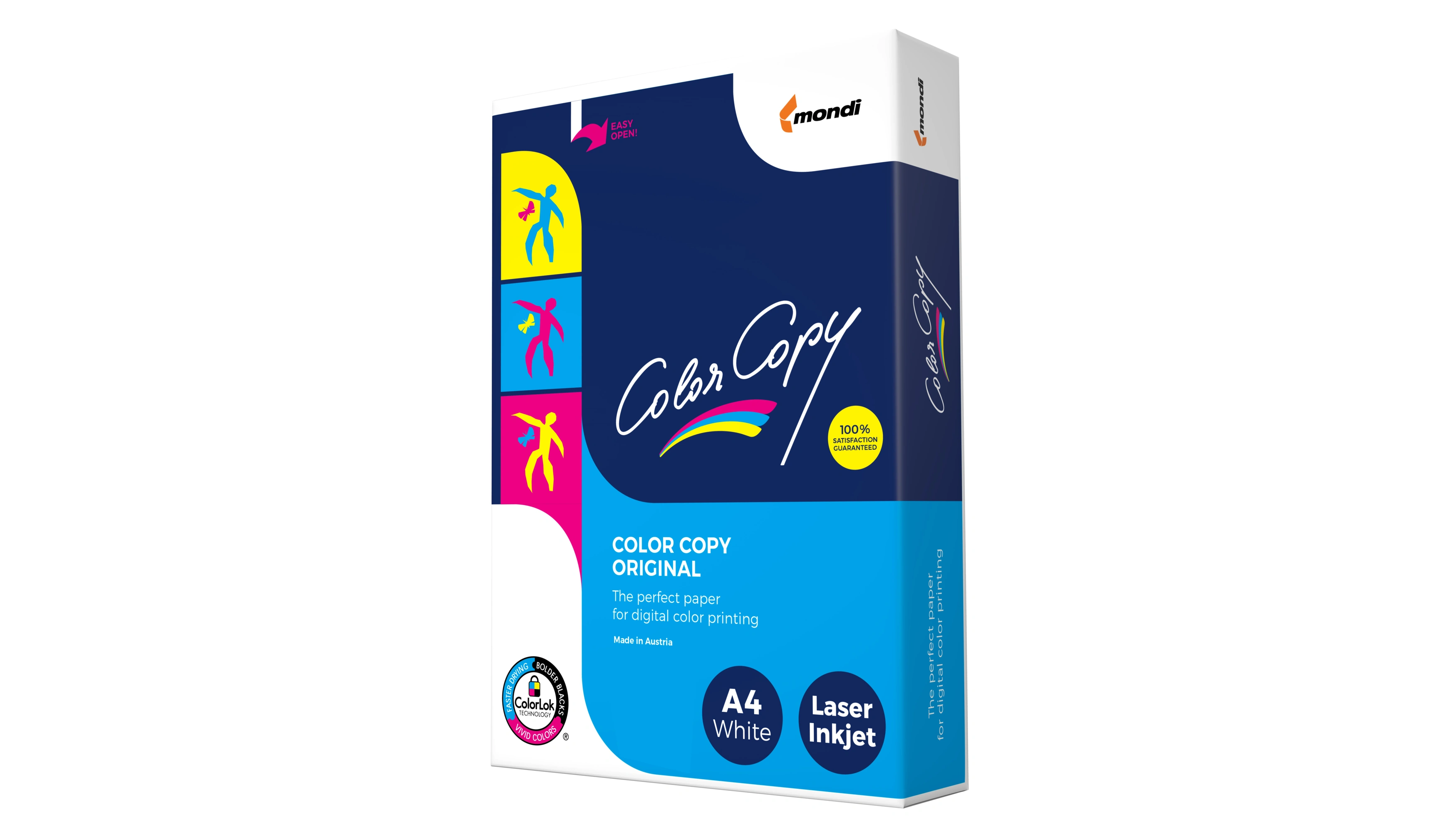 Color Copy Kopierpapier. Durch die spezielle Oberflächenbehandlung werden Drucke und Kopien besonders farbecht und brillant wiedergegeben. Sein höheres Gewicht und Volumen, die fühlbar höhere Glätte und Steifigkeit sowie hochwertigste Rohstoffe sorgen für beste Tonerhaftung und weitestgehende Geräteschonung. Von allen Geräteherstellern empfohlen.