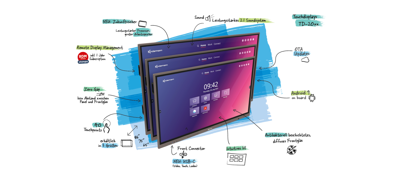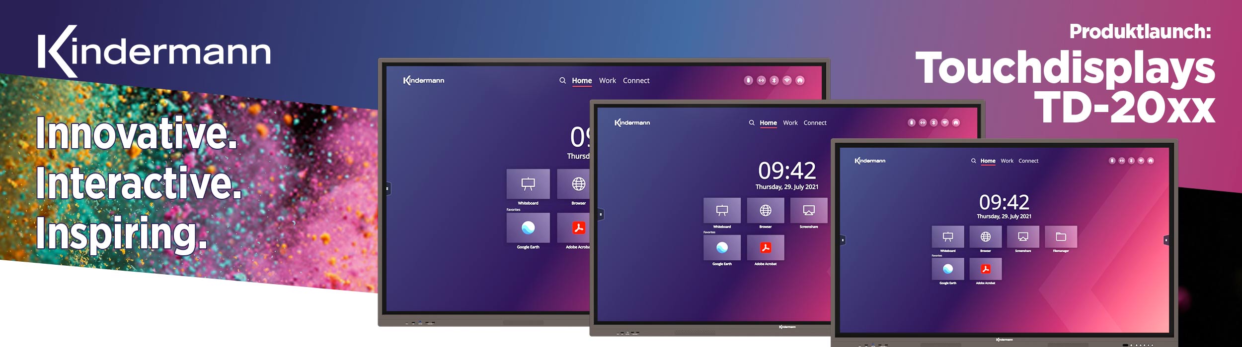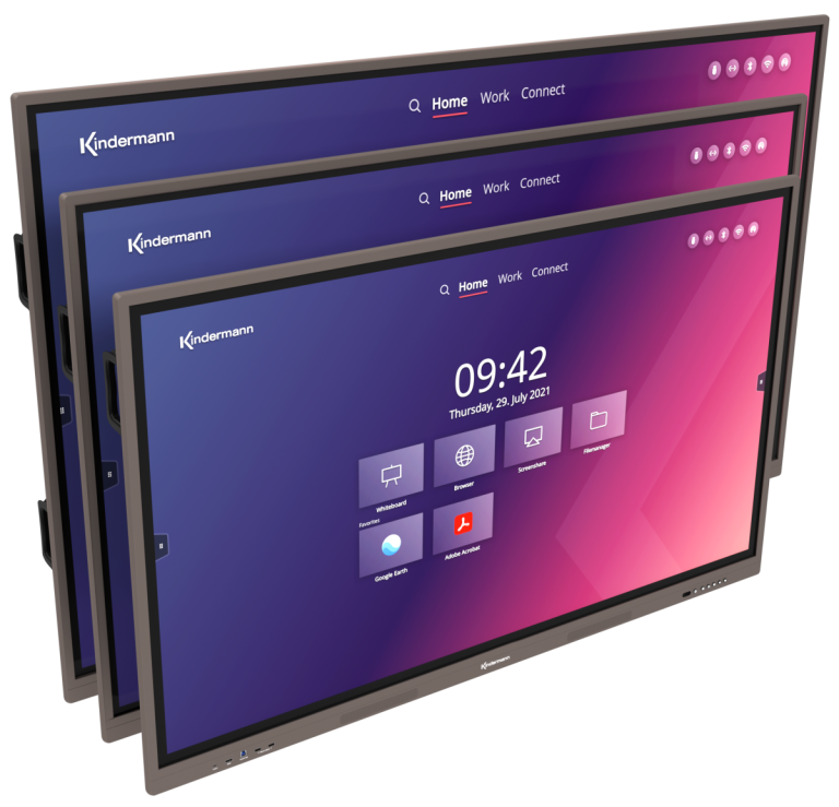 Touchsdisplays, die Einfach und unmittelbar funktionieren - ohne Schulungsbedarf der Nutzer, ohne Kabel, ohne überflüssigen Schnickschnack, ohne Wenn und Aber.Präsentation, Zusammenarbeit, Austausch. Die Displayserie von Kindermann mit ihrer eigenentwickelten, intuitiven Benutzeroberfläche ist erste Wahl für den Einsatz in Unternehmen und im Schulwesen mit einem herausragenden Preis-Leistungs-Verhältnis. 40 Touchpunkte (TD-20xx) bei 4K-UHD-Auflösung, eine antibakterielle Oberfläche für hygienische Zusammenarbeit auch bei vielen Benutzern, ein hochpräziser Infrarot-Touchrahmen für genaue Objekterkennung und vieles mehr – wir machen Teamwork und Präsentation einfach.