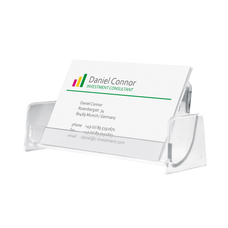 Visitenkarten-Aufsteller für die perfekte Präsentation Ihrer Visitenkarten. Standfest und rutschsicher, hochwertige und glasklare Optik.